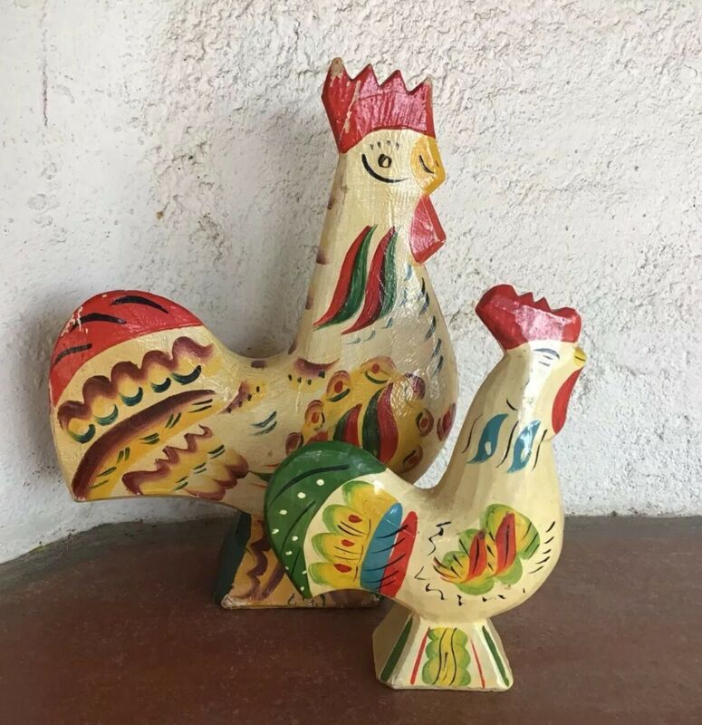 Title (ebay affiliate link): 2 VTG DALA ROOSTER CHICKEN FIGURES HAND CARVED PAINTED SWEDEN FOLK ART SIGNED