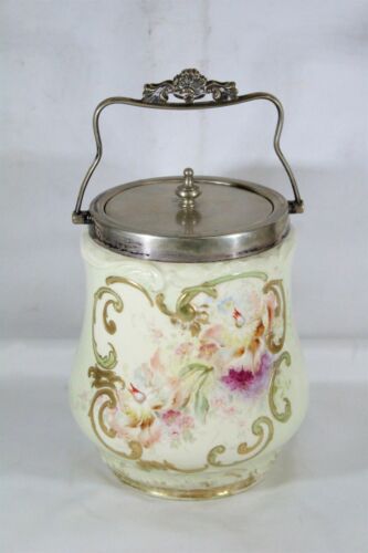 Title (ebay affiliate link): Antique Art Nouveau Metal Lidded Porcelain Biscuit Jar Nestor Birmingham Flowers