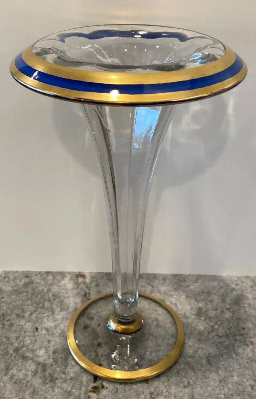 Art Deco Fluted Trumpet Glass Vase Gilt Blue