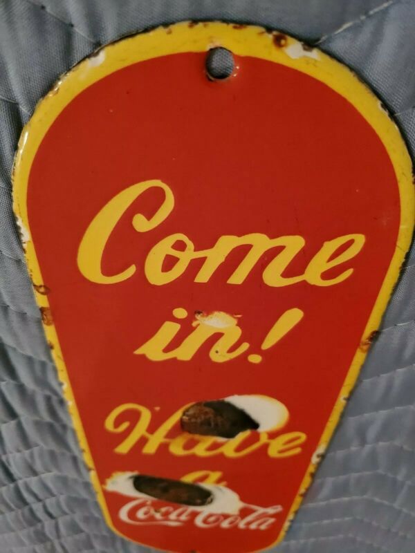 VINTAGE COCA COLA COME IN! 12" PORCELAIN METAL DOOR PUSH PLATE SODA POP GAS SIGN