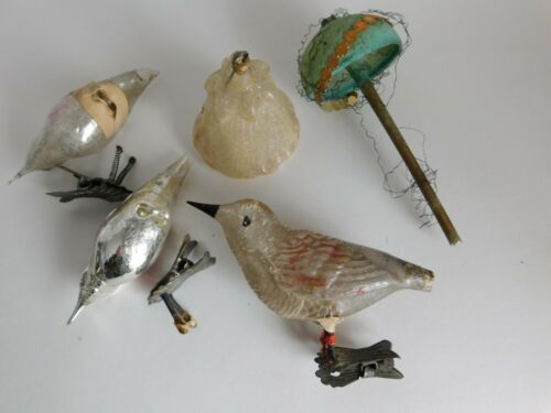 5 Old Antique Fragile Broken Glass Christmas Ornaments Wired Parasal Bell Birds