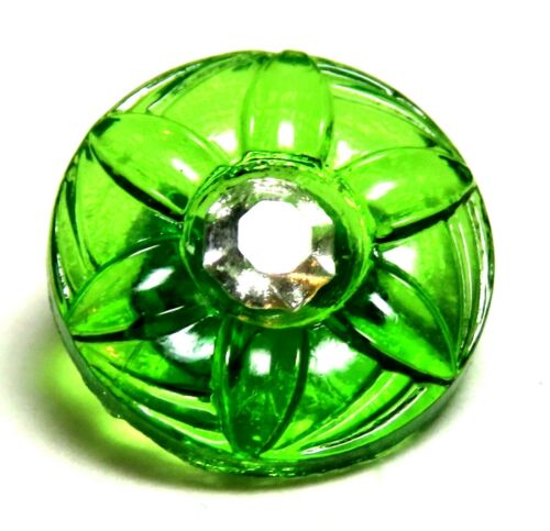 LOVELY 1940''S GREEN DEPRESSION GLASS BUTTON w/BRILLIANT GLASS RHINESTONE JEWEL