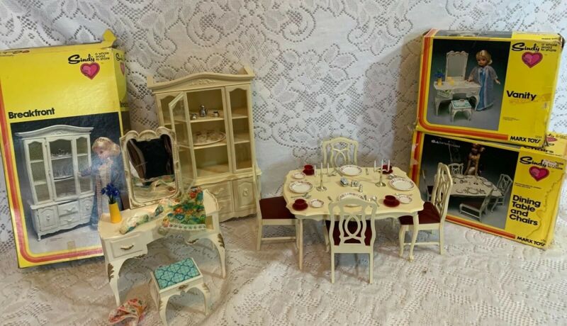 Title (ebay affiliate link): VINTAGE SINDY DINING ROOM PLAYSET TABLE CHAIRS & BREAKFRONT Hutch Vanity