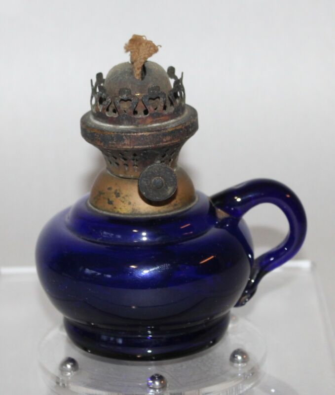 ANTIQUE Miniature Oil Lamp COBALT BLUE GLASS Finger Lamp