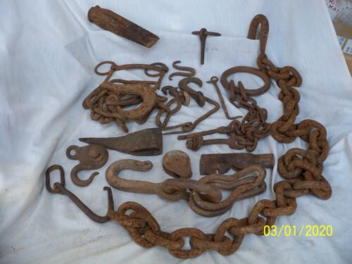 Title (ebay affiliate link): Misc. Lot of Farm Tools - Hammer Ax Head, Hand Forged Hooks, Evener Chain (#2)