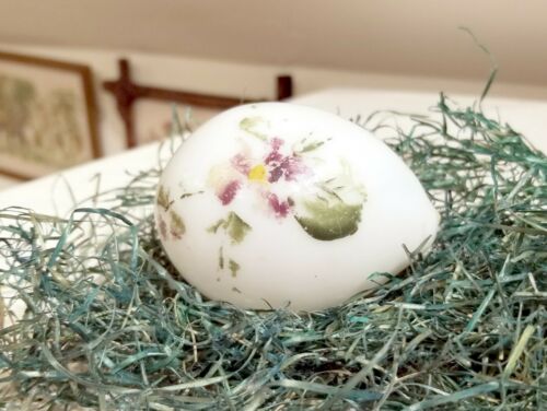Title (ebay affiliate link): Purple Violets, with Leaves. Milk Glass Easter Egg. Germany. Early 1900s. Worn.