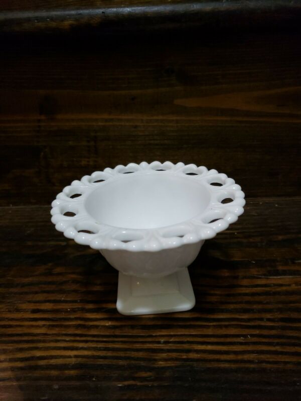 Title (ebay affiliate link): Vintage Lace Edge Milk Glass White Pedestal Footed Compote Candy Dish Bowl