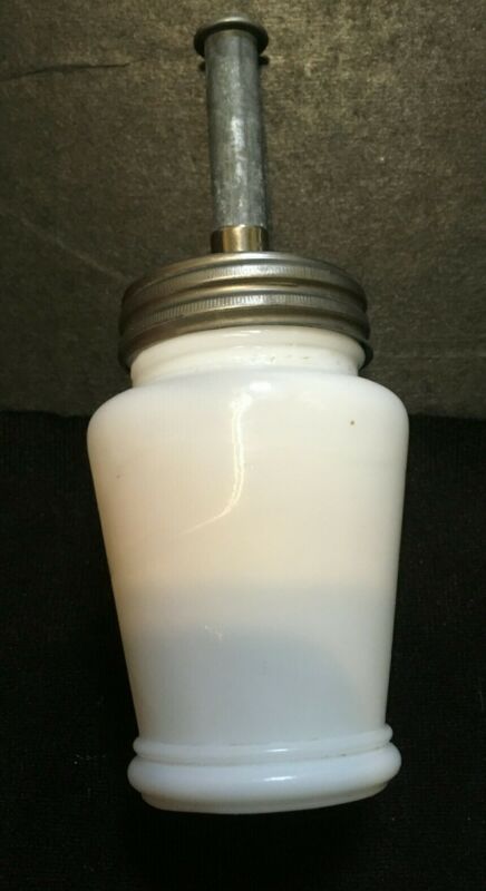 Title (ebay affiliate link): ANTIQUE VTG DENTAL TOOTH POWDER MILK GLASS JAR W/ TIN PULL-UP POUR SPOUT, TEETH.