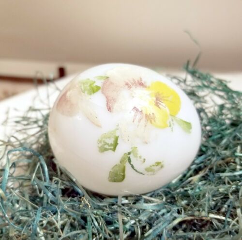 Title (ebay affiliate link): Pansies, with Leaves. Milk Glass Easter Egg. Germany. Early 1900s. Little Worn.