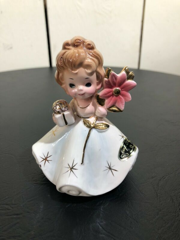 Title (ebay affiliate link): Vintage Josef Originals Figurine Girl Holding Gift And Flower Gold Trim