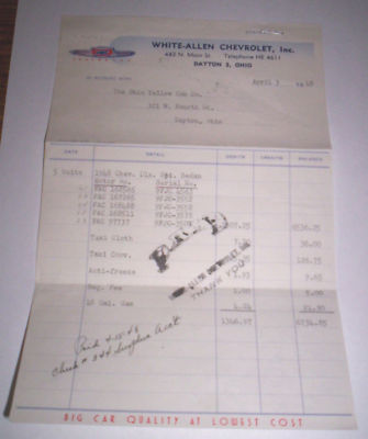 1948 Chevrolet Dealer Invoice Yellow Cab Taxi Deluxe NR