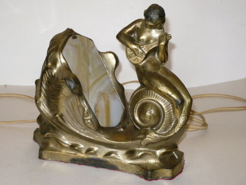 ART DECO TABLE NIGHT LIGHT / LAMP MERMAID AND SHELL FIGURAL PLAYING MANDOLIN