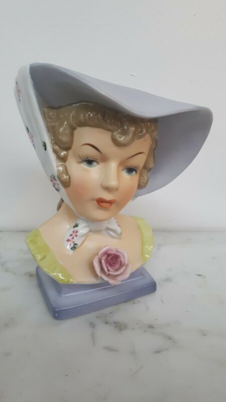 Title (ebay affiliate link): Very Pretty Vintage Lady Head Vase Wearing Hat & Scarf & Single Rose