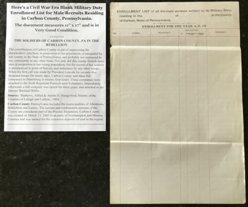 Title (ebay affiliate link): CIVIL WAR PA MILITARY DUTY ENROLLMENT DOCUMENT CARBON COUNTY PENNSYLVANIA 1860s!