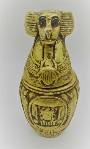 Title (ebay affiliate link): BEAUTIFUL OLD ANTIQUE EGYPTIAN GOLD GILDED CANOPIC JAR WITH SEHKMET HEAD