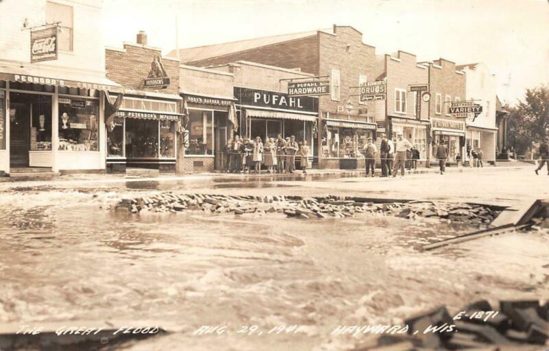 RPPC HAYWARD WISCONSIN FLOOD HARDWARE COCA-COLA SIGN REAL PHOTO POSTCARD (1941)