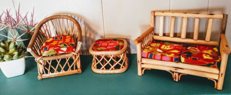 Vintage Doll Furniture Chairs & a Table Wicker Rattan Miniature