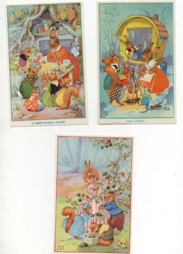 3 VINTAGE ART postcards: ANIMALS by RENE CLOKE rabbit squirrel