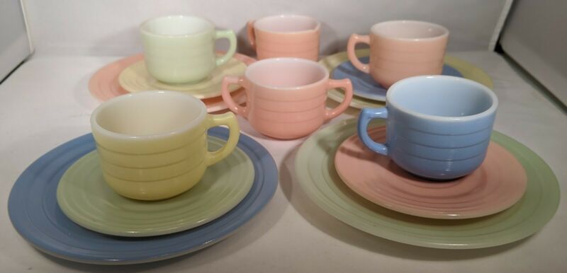 Title (ebay affiliate link): Vintage HAZEL ATLAS Milk Glass Childs Tea Set Pastel Cups Saucers Plates 14pcs