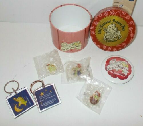 Title (ebay affiliate link): Vintage Lot of 7 Pocket Dragons Pins Key Chains Button Box by Real Musgrave