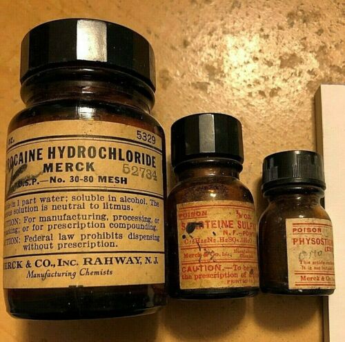 Title (ebay affiliate link): 3 Merck,Rahway,NJ Drug Bottles. 2 Have "POISON" on labels. Old Drug Store Cellar