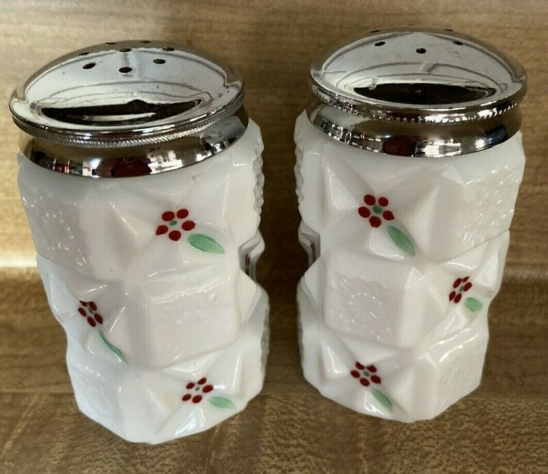 Title (ebay affiliate link): Westmoreland Old Quilt White Milk Glass Salt And Pepper Shakers with Red & Green