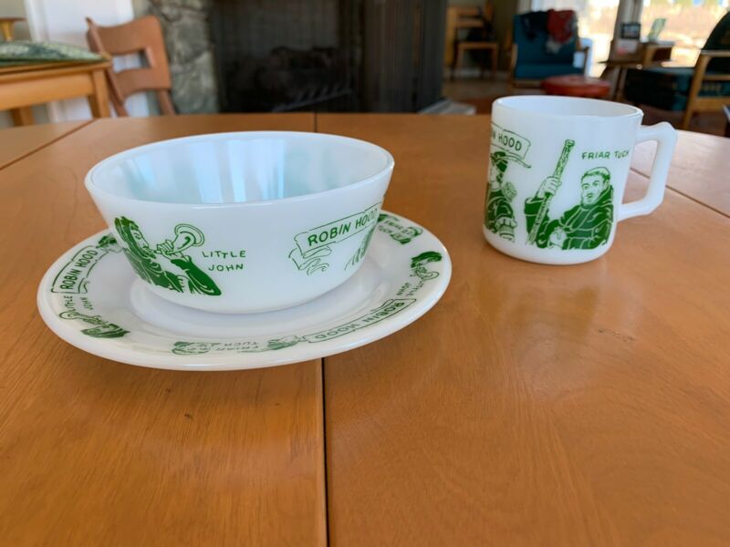 Hazel Atlas Platonite Milk Glass Robin Hood Child''s Set Vintage