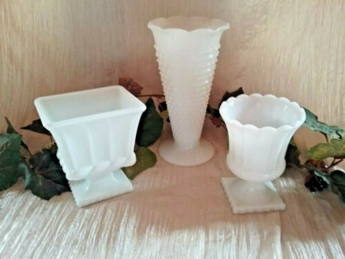 Title (ebay affiliate link): 3 Vintage Lg Milk Glass Vase Planter Hobnail Fluted White Wedding Events Decor