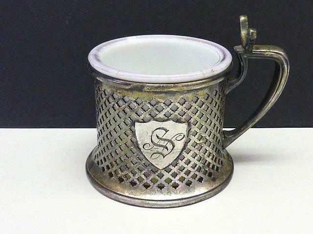 Antique Vintage Pierced 2Part Apollo Silver Plate Shaving Mug Milk Glass S Monog