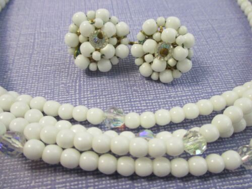 Milk Glass AB Crystal Vintage Necklace & Clip Earring SET