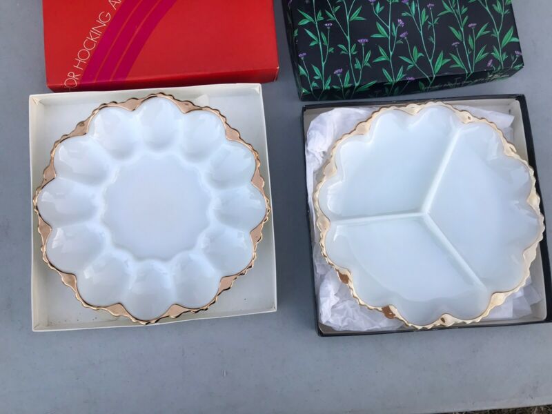 Title (ebay affiliate link): Vintage Anchor Hocking Milk Glass Divided Dish & Deviled Egg Dish Original Boxes