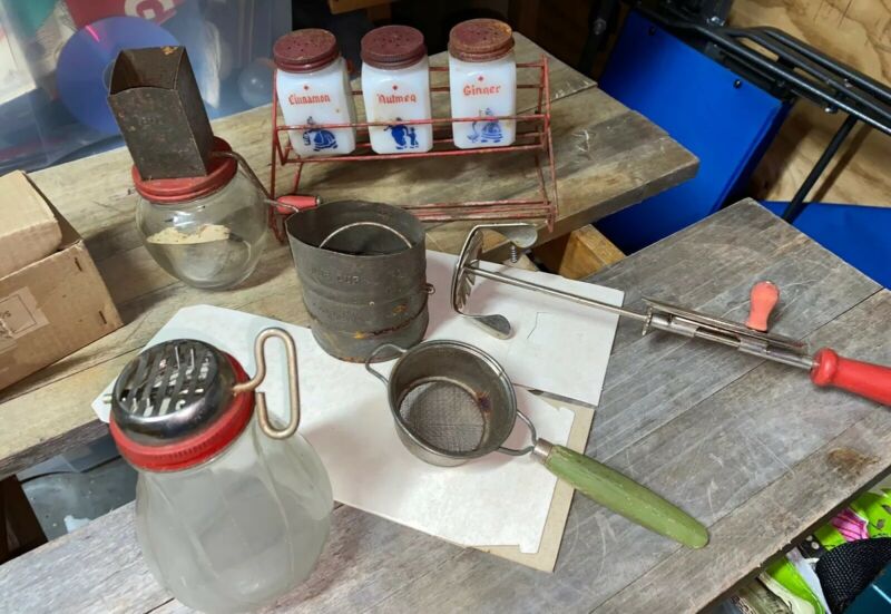 Title (ebay affiliate link): Lot Vintage Nut Meat Chopper Sifter Milk glass Spice Rack Metal Top Grinder Old