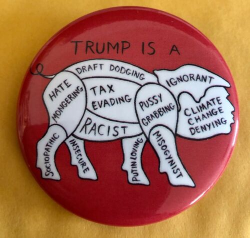 Title (ebay affiliate link): Sarcastic Anti-Trump is a Draft-Dodging, Ignorant, Racist and More Pin