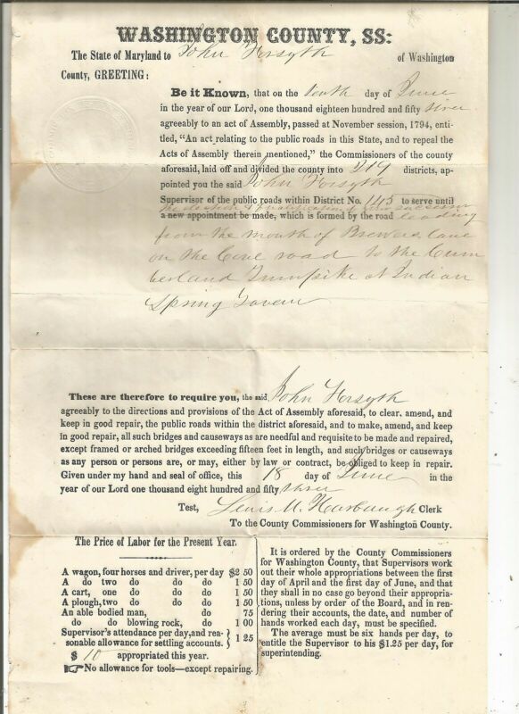Title (ebay affiliate link): MARYLAND 1859 APPOINTMENT DOCUMENT, WASHINGTON COUNTY, ROAD COMMISSIONER