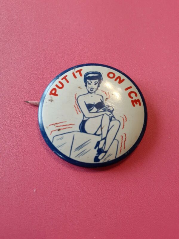 Title (ebay affiliate link): Vintage "Put It On Ice " Coca Cola Pin Button Woman in a Bikini Sitting on Ice.