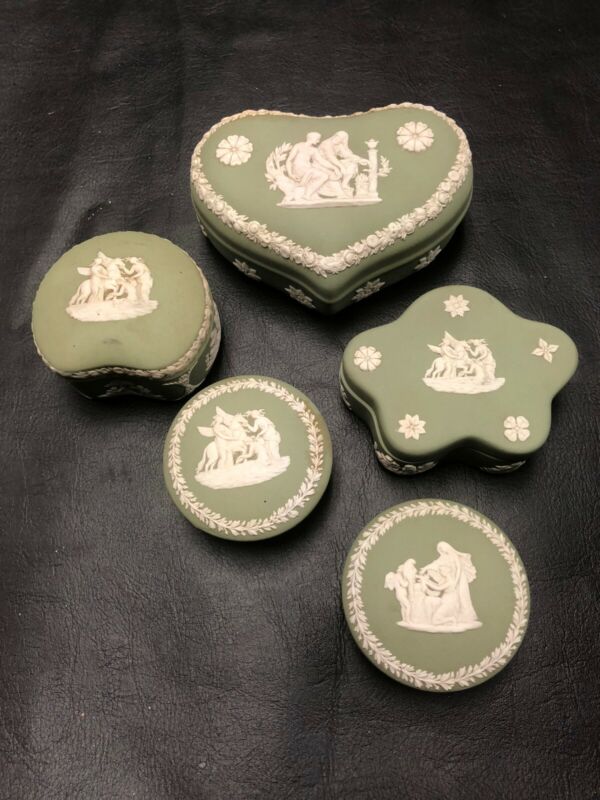 Title (ebay affiliate link): Lot of 5 Wedgwood Jasperware Sage White Trinket Boxes - 5-3/8"Heart, Rounds More