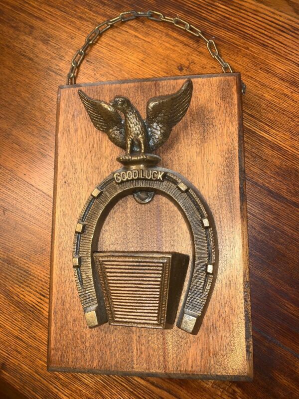 Title (ebay affiliate link): VINTAGE BRASS UPSIDE DOWN GOOD LUCK HORSESHOE W EAGLE & MATCH HOLDER? ON PANEL