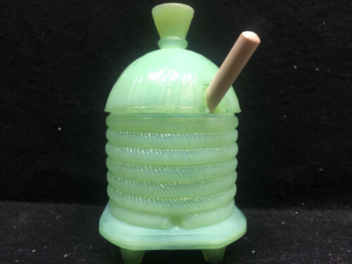 Title (ebay affiliate link): JADEITE Green milk glass honey pot bee hive pattern jar dish mustard dipper jade