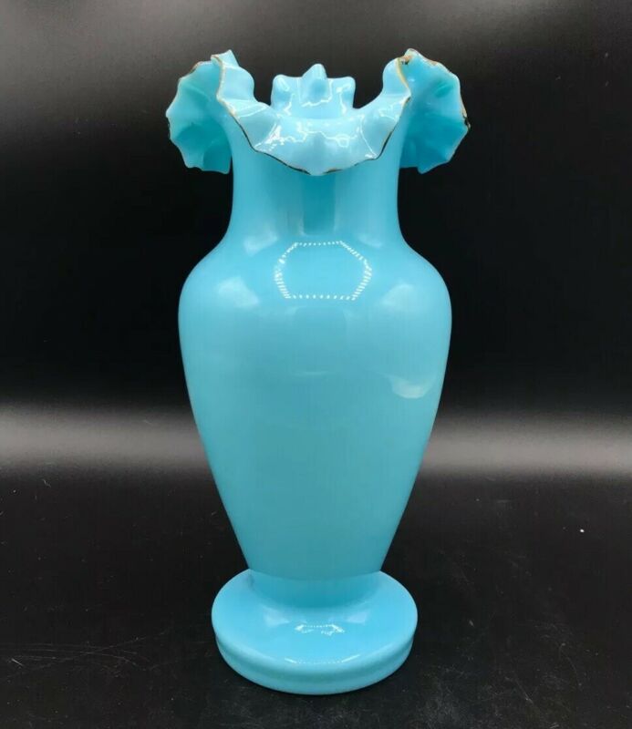 Title (ebay affiliate link): Antique Bristol Blue Opaque Milk Glass Hand Painted Gold Ruffled Edge Vase