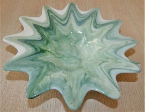 Title (ebay affiliate link): SLAG GLASS Green and Milk Glass Bowl (Unsigned) Pink Opalescent Edges - Mint!