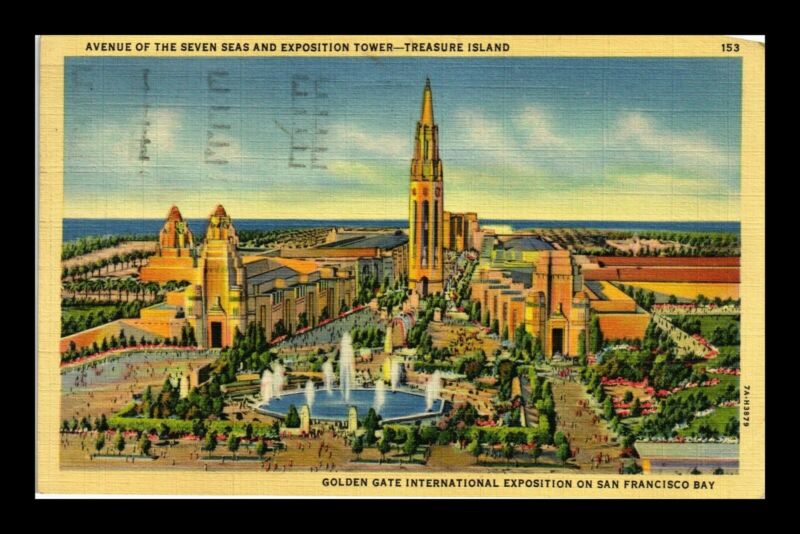 Title (ebay affiliate link): US LINEN POSTCARD AVENUE OF SEVEN SEAS EXPOSITION TOWER GOLDEN GATE EXPO
