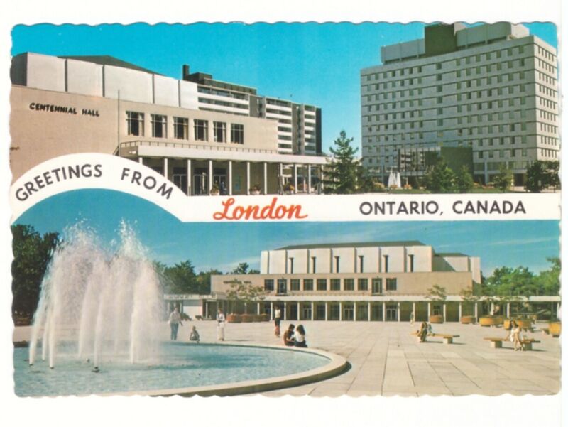 Title (ebay affiliate link): Centennial Square & Fountain, City Hall, London, ON, Chrome Split View Postcard