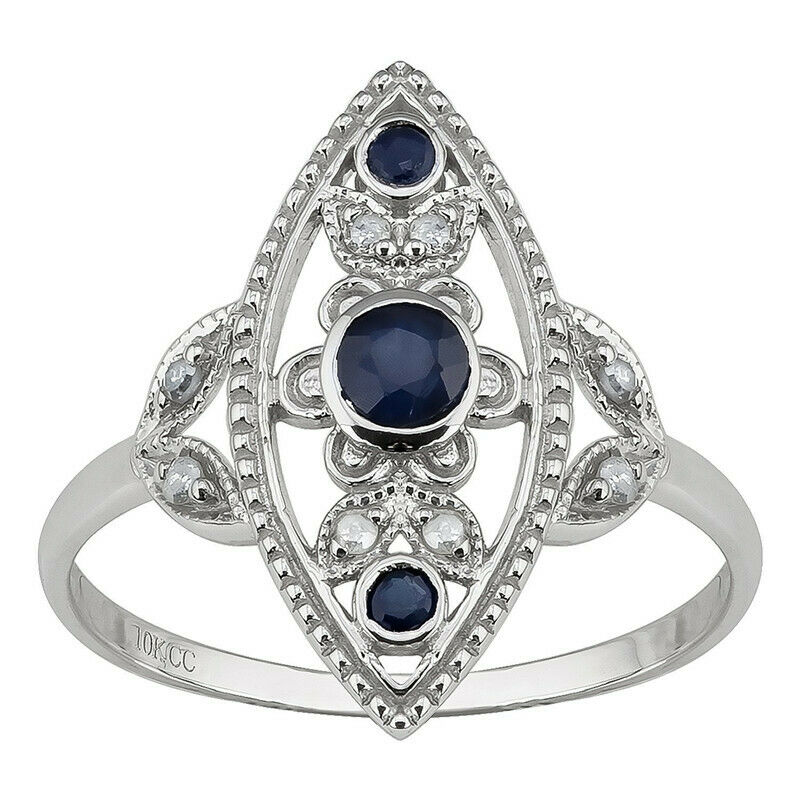 Title (ebay affiliate link): 10k White Gold Antique Style Genuine Round Sapphire and Diamond Ring size 10