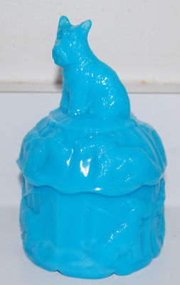 Akro Agate Blue Slag Glass Scottie Dog Powder Jar Box