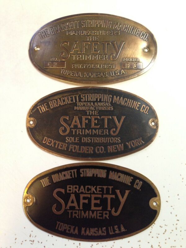 Title (ebay affiliate link): 3 ANTIQUE BRACKETT STRIPPING MACHINE CO. SAFETY TRIMMER BRASS PLAQUE SIGNS