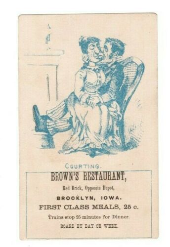 Orig 1870''s Trade Card - Couple Kissing - Brown''s Restaurant, Brooklyn IA