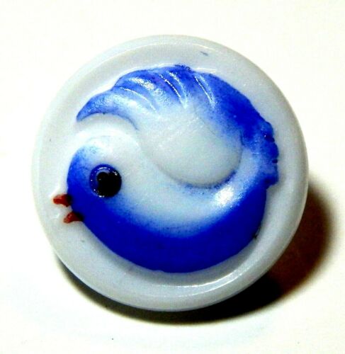 ADORABLE 1940''S WHITE MILK GLASS CHILD''S BUTTON w/SWEET "BLUE BIRD"