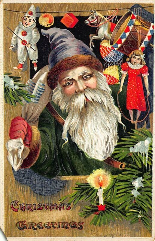 Title (ebay affiliate link): Christmas Greetings Green Suited Blue Hat Santa Claus Embossed Postcard