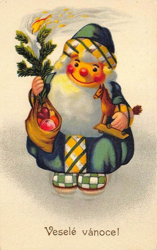 Title (ebay affiliate link): Happy Nights! Green Suited Cartoon Santa Claus Postcard