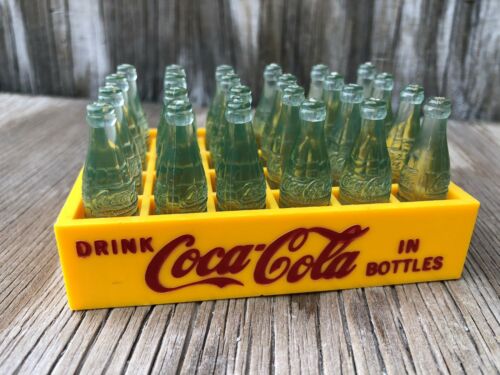 Title (ebay affiliate link): Vintage Mini Toy Coca Cola Mini Coke Bottles Yellow Plastic Crate Case 24, 1960s